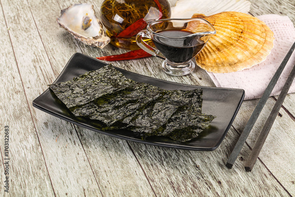 Green nori seaweed chips with soya sauce