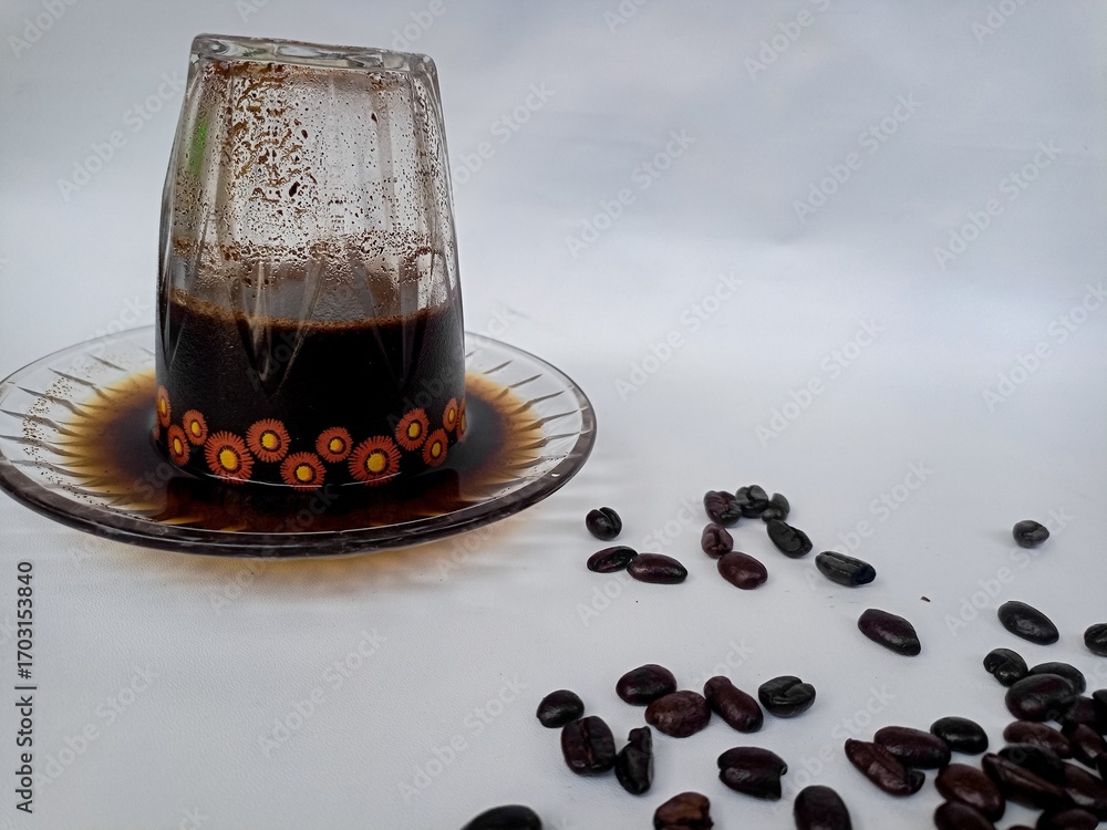 Freshly brewed black coffee served in an inverted cup with coffee beans spread around, representing lifestyle and cafe culture.