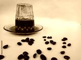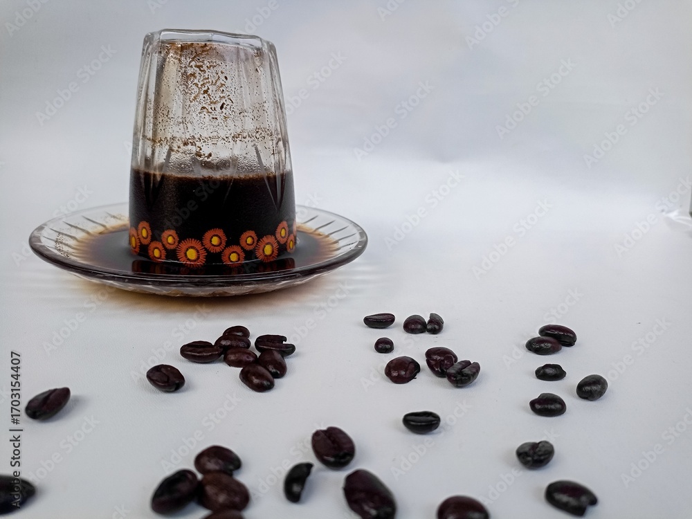 Freshly brewed black coffee served in an inverted cup with coffee beans spread around, representing lifestyle and cafe culture.