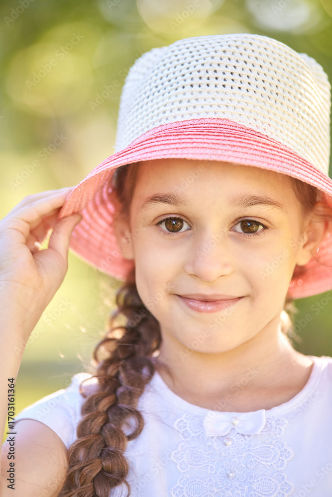 Smiling caucasian young girl in pink and white hat outdoors on a sunny day.