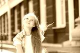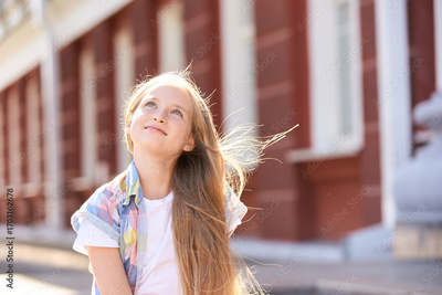 Smiling caucasian female child outdoors in sunny urban setting with long blonde hair and casual attire.