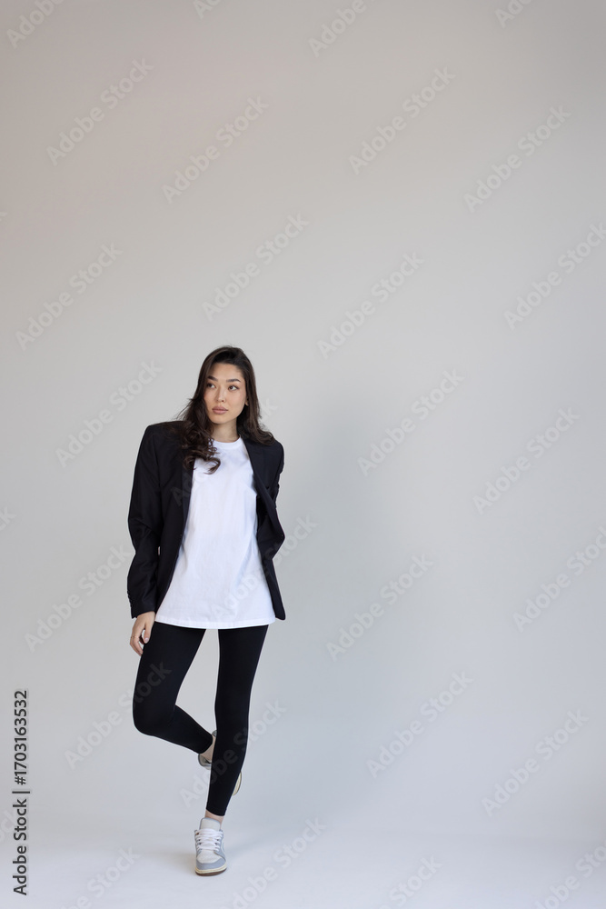 Young Woman in Casual Outfit Posing on White Studio Background
