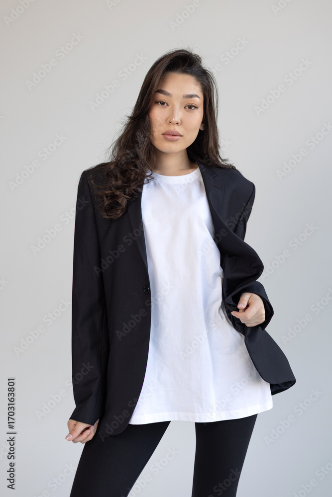 Close-Up T-Shirt Mockup with Young Woman in Blazer on Neutral Background