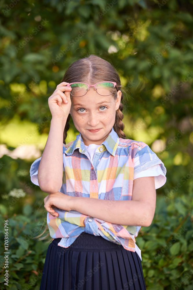 Young caucasian female child with braided hair holding glasses in a colorful shirt in nature.