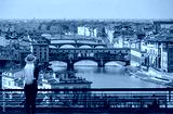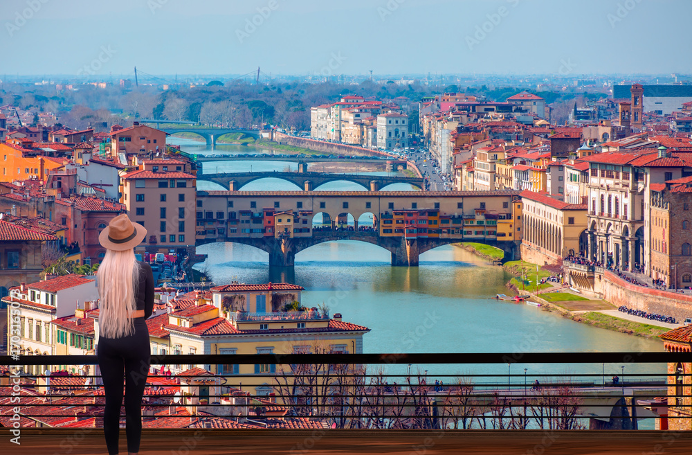 A beautiful woman in black tights and a beige hat is standing near Ponte Vecchio over Arno river in Florence, Italy