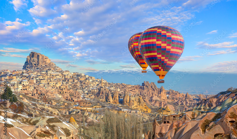 Hot air balloon flying over spectacular Cappadocia - Rock formation in Cappadocia following a heavy snow fall. Everything covered snow under sunset sky