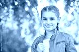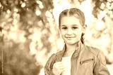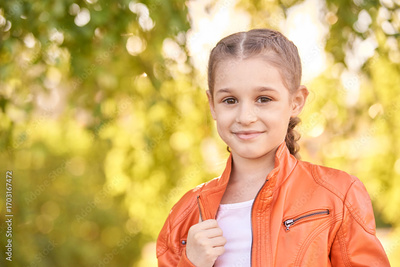 Young caucasian girl in orange jacket smiling outdoors with green leafy background.