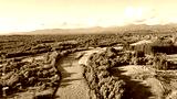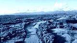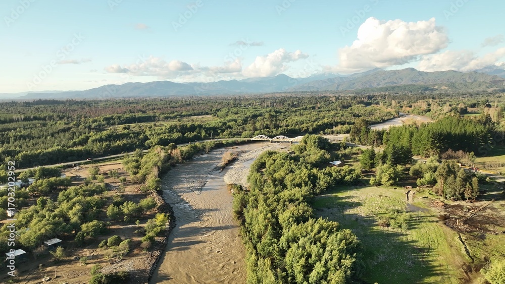Aerial view of Three Arch Tres Arcos bridge and Ancoa river in Region Maule after flooding in 2023, Chile