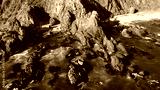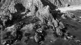 Aerial top view by drone of ocean blue waves break on high cliff of a rocky mountain. Danger sea waves on a beach