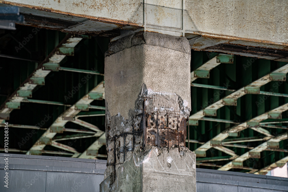 Close up of damaged concrete pillar under bridge.