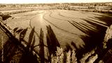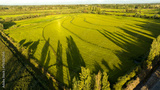 Vast green rice fields illuminated by golden sunlight in an agricultural landscape during late afternoon