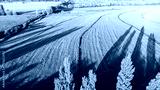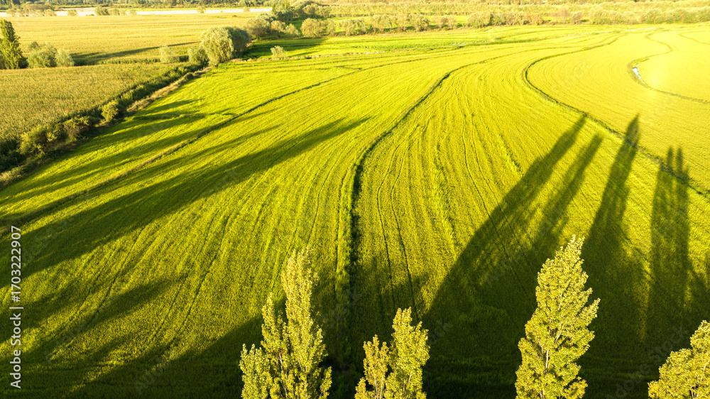 Lush green fields with long shadows cast by trees during golden hour at a rural landscape