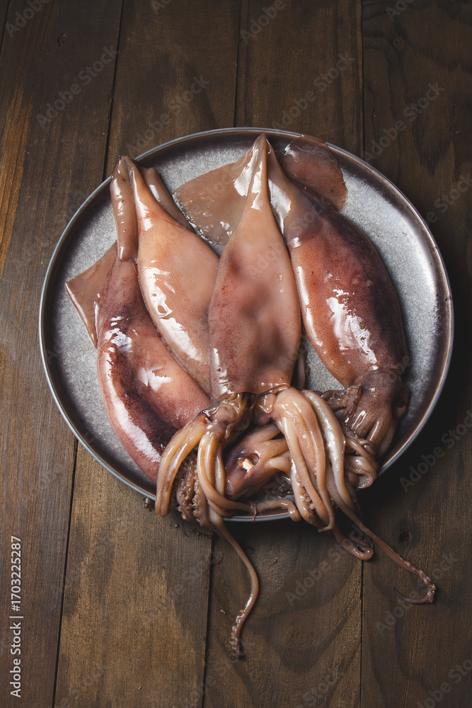 Freshly caught squids arranged neatly on a rustic plate ready for culinary preparation