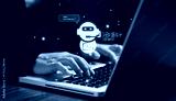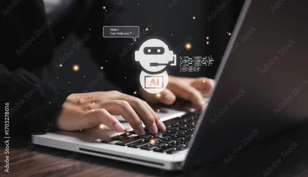 Hands typing on laptop with futuristic AI chatbot assistant hologram, concept of artificial intelligence technology, virtual customer support, digital innovation, and automation.
