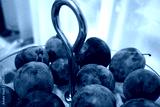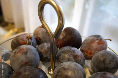 Close-up of fresh plums arranged in a transparent glass serving bowl. Healthy fruit concept.