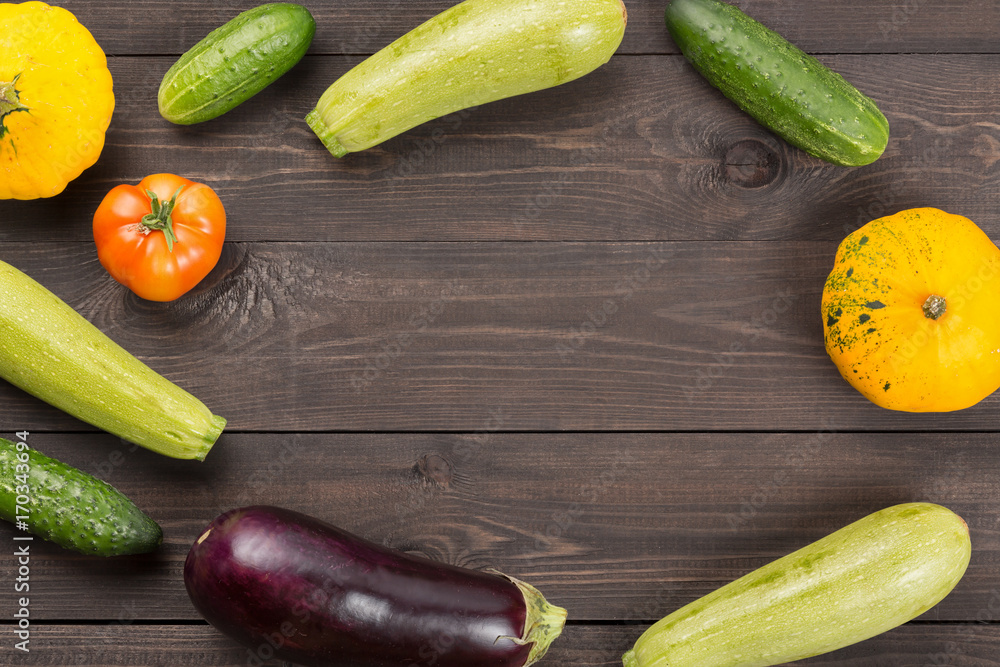 Vegetarian healthy food with vegetables. Tomato, cucumbers, bush pumpkins, eggplants and marrows on dark wooden table with copy space