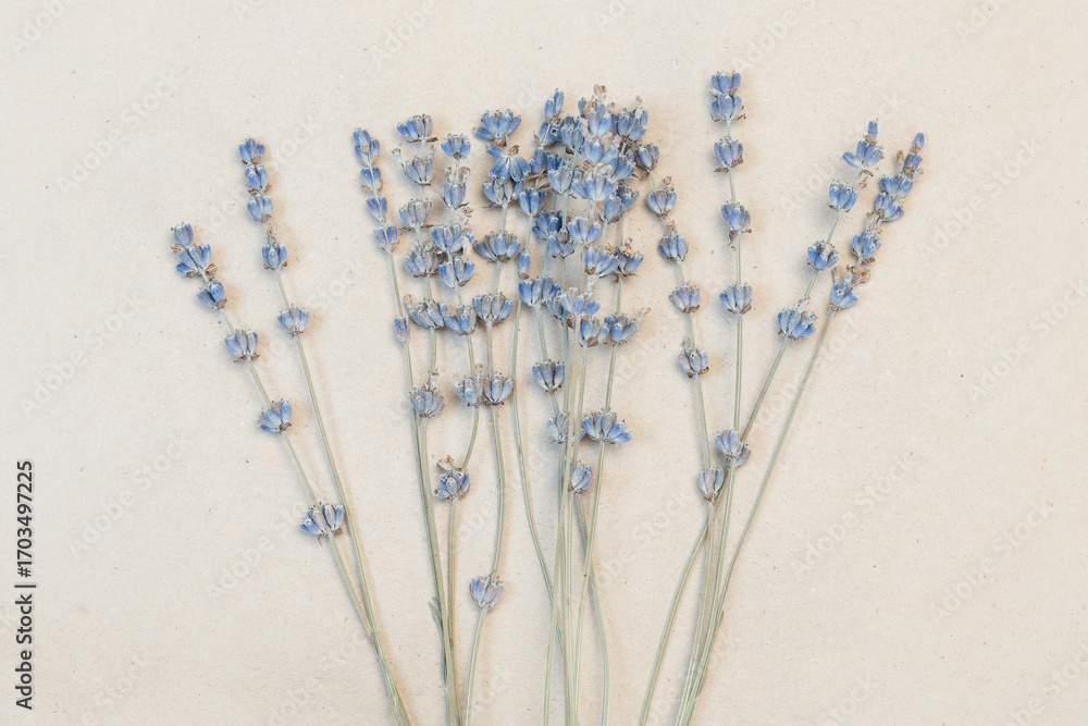 Mini dried lavender bouquet placed at center of kraft paper vintage background