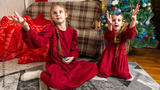 Girls sisters in front of the fir-tree with decorating and gifts. New year's eve. Christmas eve. Cozy holiday at the fir-tree with lights and decor at home.