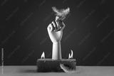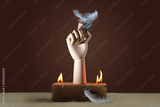 Contemporary still life: a wooden hand holds a blade on which a feather is balanced. Conceptual photography, freekbana with fire special effects.