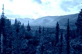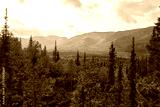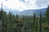 Panorama of a mountain gorge with a forest massif on a bright sunny autumn day. Tourist place for rest
