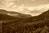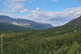 Khibiny. View from the plateau to the panorama of the mountain gorge with a forest massif on a bright sunny autumn day. Tourist place for recreation