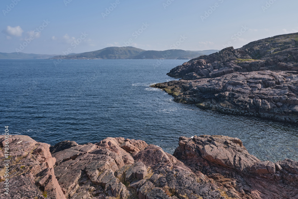 Tundra landscape on the Barents Sea coast on a bright autumn day. Autumn beauty of nature.