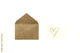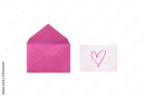From above: an opened pink glitter envelope beside a message card with a hand-drawn pink heart