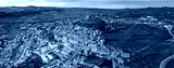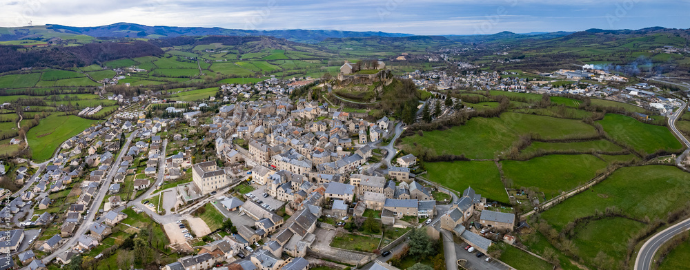 Aerial panoramic view around the old town and city Sévérac-d'Aveyron in France on a sunny afternoon