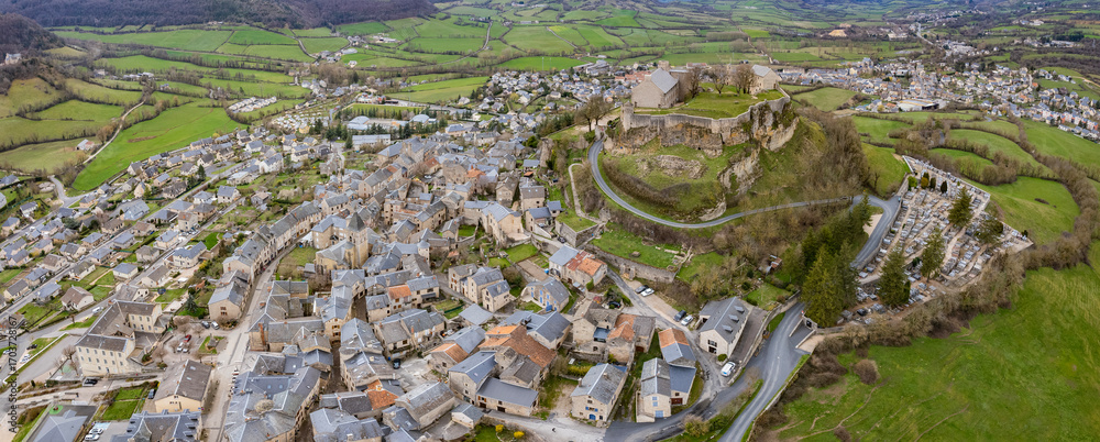 An aerial panoramic view around the old town of the city Sévérac-d'Aveyron in France on a sunny day in early spring