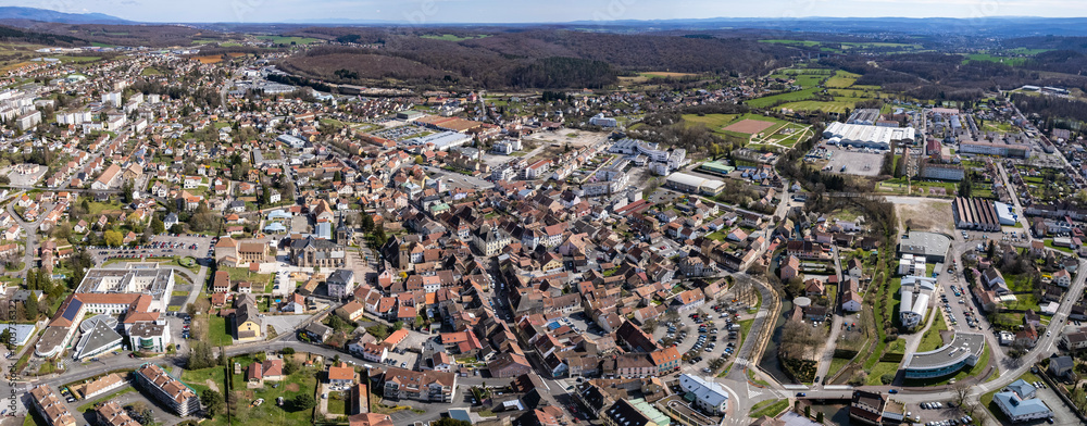 An aerial panoramic view around the old town of the city Héricourt in France on a sunny day in early spring