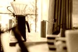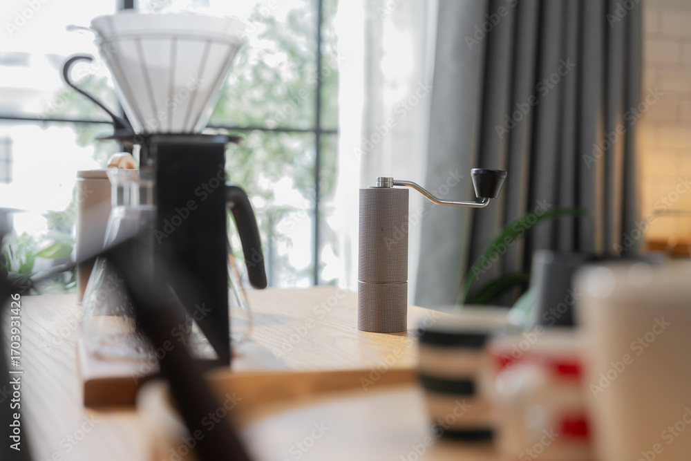 close up selection of coffee making equipment on a table Conceptual of how to making drip coffee by yourself A french press coffee maker sits on a wooden table