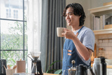 Asian amateur barista tests specialty top note coffee blend using homemade drip brewing method with professional tools at home, perfecting craft coffee making techniques for ultimate flavor extraction