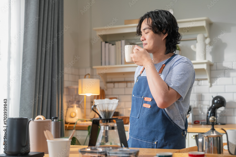 Asian amateur barista tests specialty top note coffee blend using homemade drip brewing method with professional tools at home, perfecting craft coffee making techniques for ultimate flavor extraction