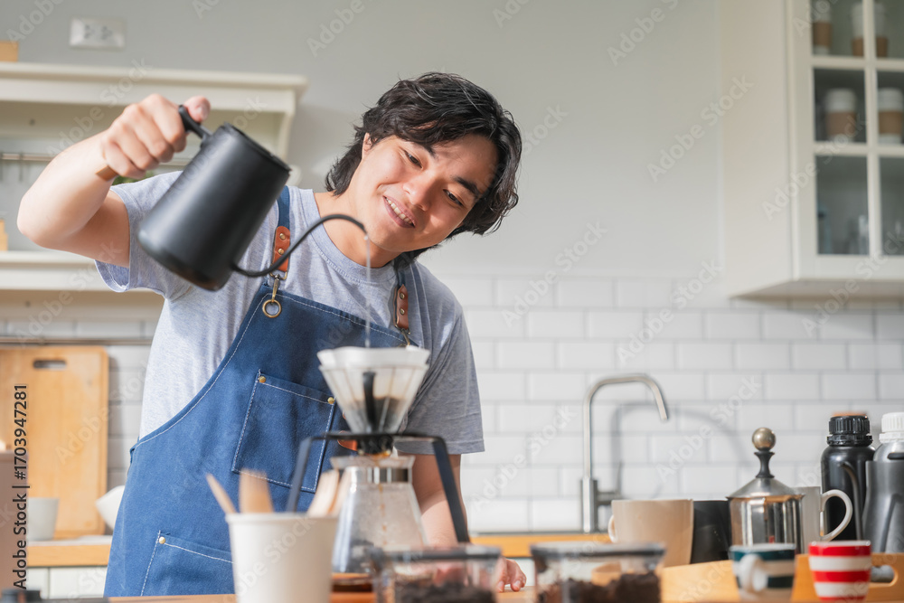 Asian Chinese male barista prepares filter coffee at home bar counter, young adult freelancer feeling relaxed while brewing specialty coffee during work break, enjoying peaceful coffee-making ritual f