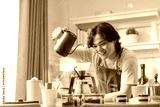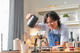 Asian Chinese male barista prepares filter coffee at home bar counter, young adult freelancer feeling relaxed while brewing specialty coffee during work break, enjoying peaceful coffee-making ritual f