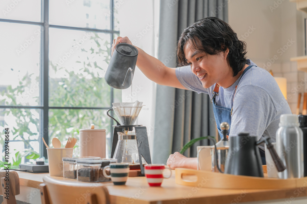 Asian Chinese male barista prepares filter coffee at home bar counter, young adult freelancer feeling relaxed while brewing specialty coffee during work break, enjoying peaceful coffee-making ritual f