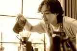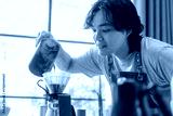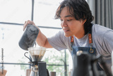 Asian Chinese male barista prepares filter coffee at home bar counter, young adult freelancer feeling relaxed while brewing specialty coffee during work break, enjoying peaceful coffee-making ritual f
