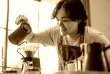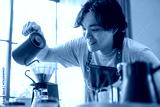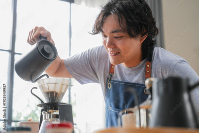 Asian Chinese male barista prepares filter coffee at home bar counter, young adult freelancer feeling relaxed while brewing specialty coffee during work break, enjoying peaceful coffee-making ritual f