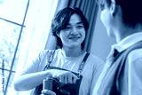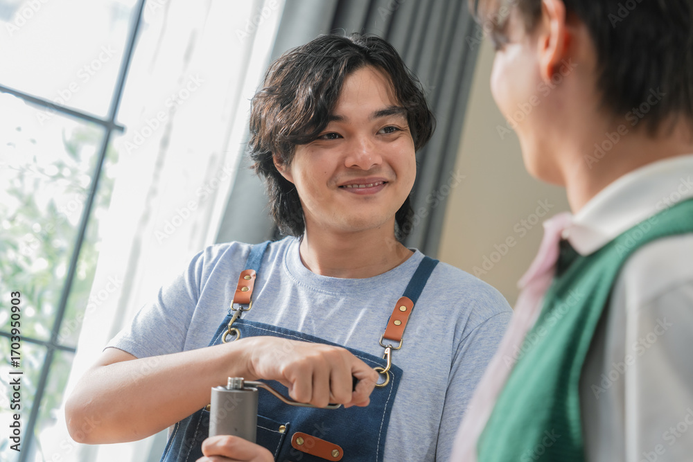 Asian mature man enjoys morning coffee at cafe using drip coffee bag in beige cup on white wood table, while young adult friends relax making specialty coffee as hobby activity at home