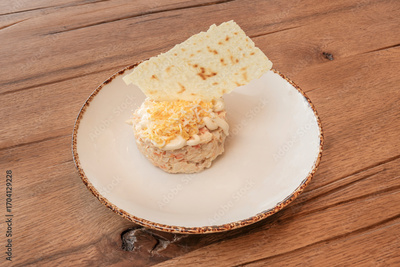 Tropical Russian salad with potatoes, mango, avocado, and shrimp, dressed with lime mayonnaise and freshly chopped cilantro