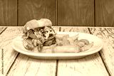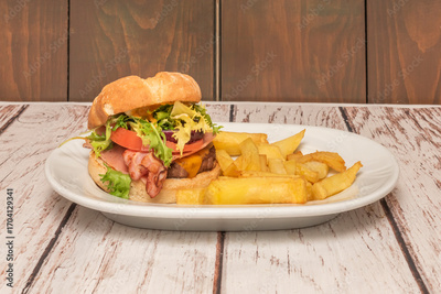 Ranch-style burger with a brioche bun, beef, cheddar cheese, onion rings, and a sticky-sweet BBQ sauce