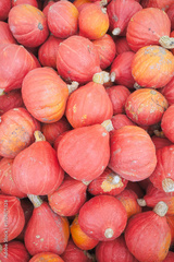 Photo of organic red kuri squash (Hokkaido pumpkin), selective focus.