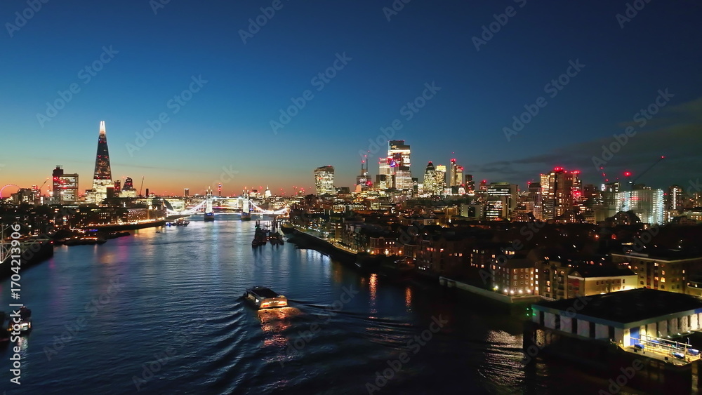 Aerial view of illuminated London's cityscape reflecting on the River Thames at dusk, with Tower Bridge, The Shard, and other landmarks creating a stunning urban nightscape. Drone flight