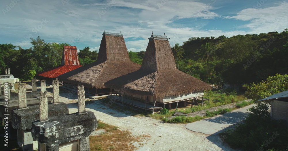 Aerial view capturing traditional Sumbanese houses with thatched roofs and ancient megalithic tombs in a rural village on Sumba Island, Indonesia, highlighting unique cultural heritage