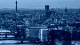 United Kingdom, London: Aerial view capturing London's iconic skyline at sunset, featuring BT Tower, St. Paul's Cathedral, and illuminated buildings along the River Thames. Drone flight