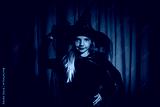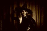 Joyful little witch posing for Halloween celebration in a spooky atmosphere with orange drapes and mystical flair