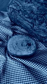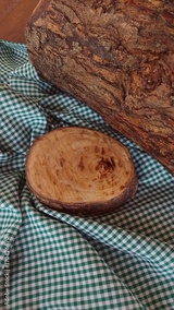 Expositor rústico de produto, cepo de madeira e tronco de árvore sobre pano quadriculado verde xadrez