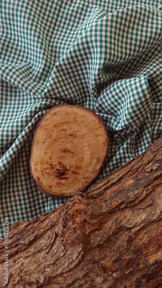 Plataforma de madeira e tronco de árvore em pano verde xadrez, expositor rústico de produto