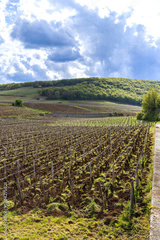 Clos de Vougeot vineyard rows growing under cloudy sky in Burgundy, France