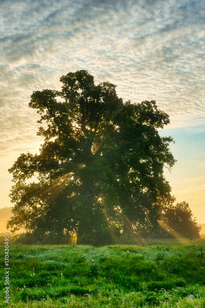Samotne drzewo na łące o wschodzie słońca z promieniami światła i mgłą